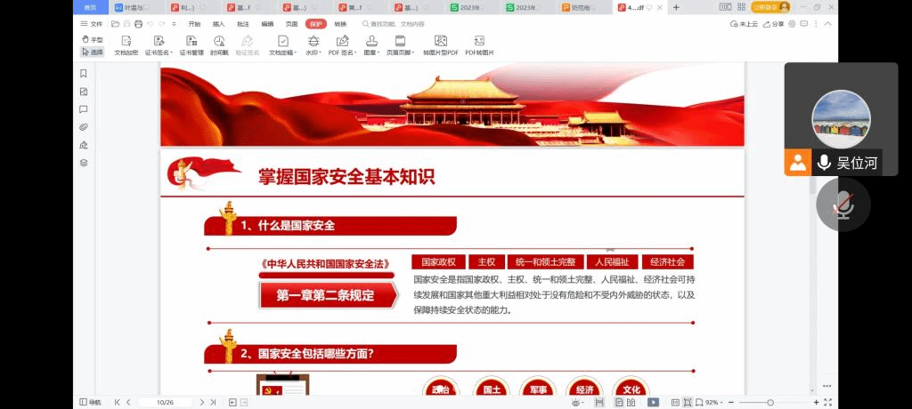2023年4月15日为第八个全民国家安全教育日,吴位河介绍了全民国家安全教育日概况及本次教育日的主题,带领同学们深入学习了国家安全基本知识,了解了相关法律法规及真实案例。他谈到,只有人人参与,人人负责,国家安全才能真正获得巨大的人民性基础,也才能有坚实的基础保障。