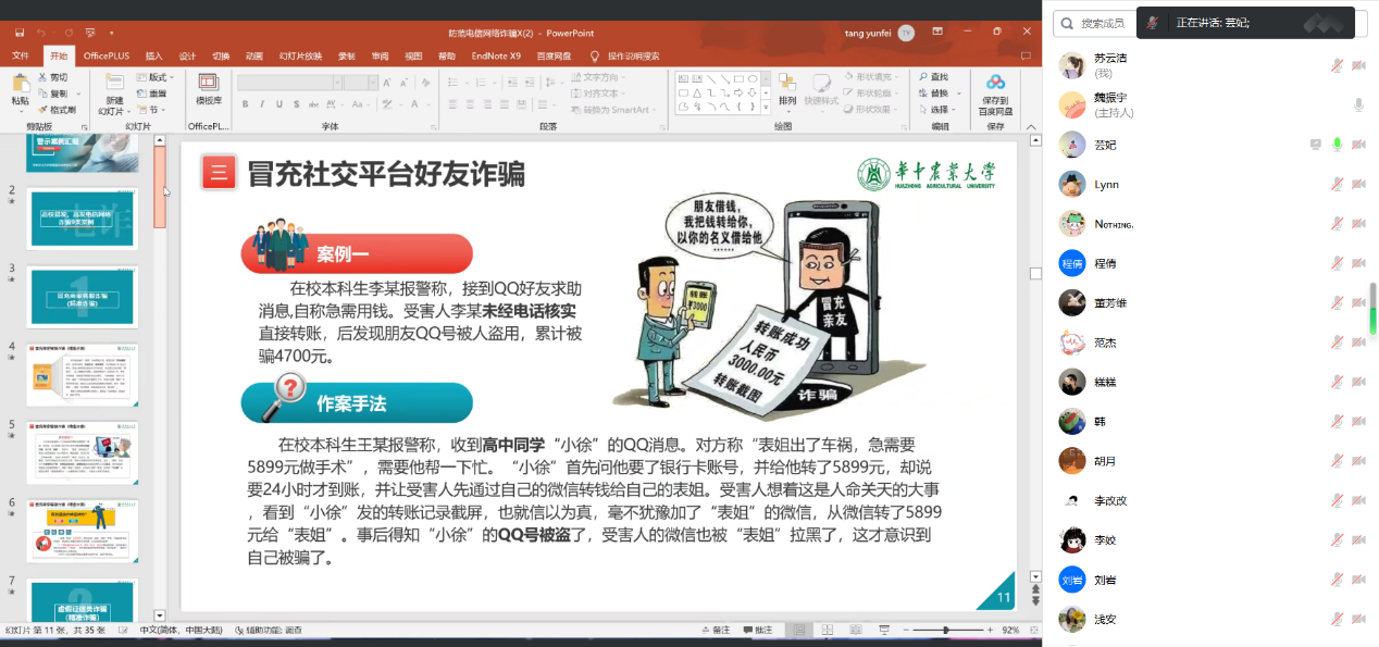 接着,第二部分防范电信网络诈骗的内容由2020级蔬菜学硕班心理委员唐芸妃同学主持,主要介绍与分析了九类电信网络诈骗案例。通过本次班会,同学们了解到,电信网络诈骗可分为冒充商家客服诈骗、虚假征信类诈骗、冒充社交平台好友诈骗、刷单诈骗、虚假购物类诈骗、网络游戏交易诈骗、网络投资理财诈骗、利用时事热点诈骗、敲诈勒索类诈骗等类型。唐芸妃谈到,无法准确确认身份,电话短信网络见不到真人,同时要求输入汇款转账等敏感信息,即可确定为诈骗。通过本次电信网络诈骗案例介绍与分析,同学们增强了对诈骗手段的了解,同时防范意识也有所提高。防范电信网络诈骗离不开每个人的努力,只有大家共同树立防范意识,才能有效杜绝电信网络诈骗案件的发生。