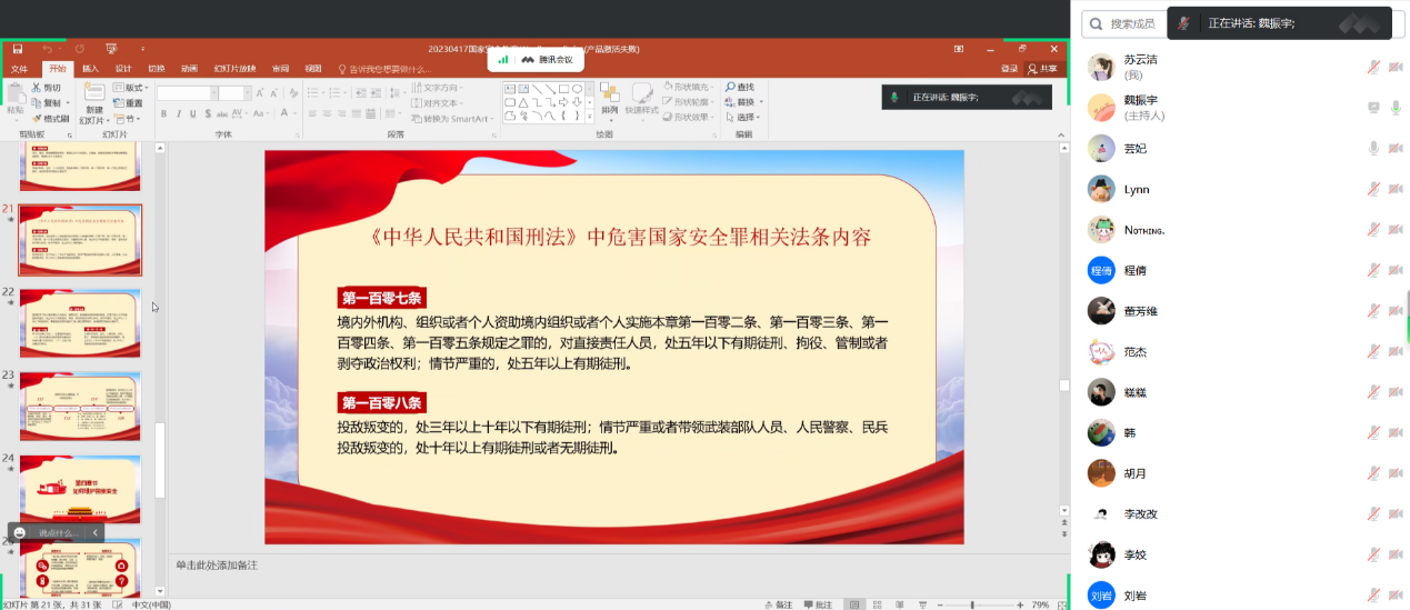 为进一步提高国家安全意识和防诈骗安全意识,2020级林学硕士班与2020级蔬菜学硕班于4月21日召开安全教育主题联合班会,本次班会由2020级林学班班长魏振宇与2020级蔬菜学硕班心理委员唐芸妃共同主持,会议内容主要学习了国家安全教育、防诈骗安全教育知识。