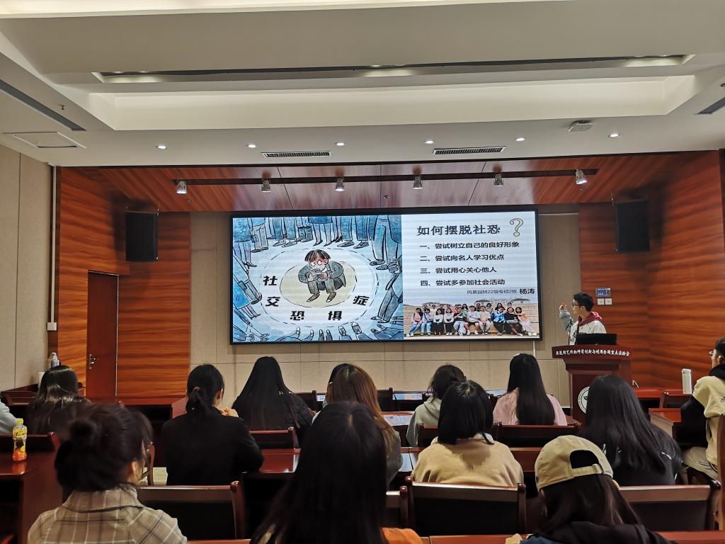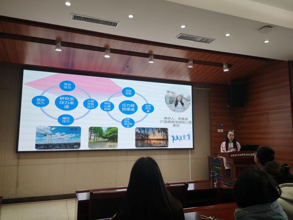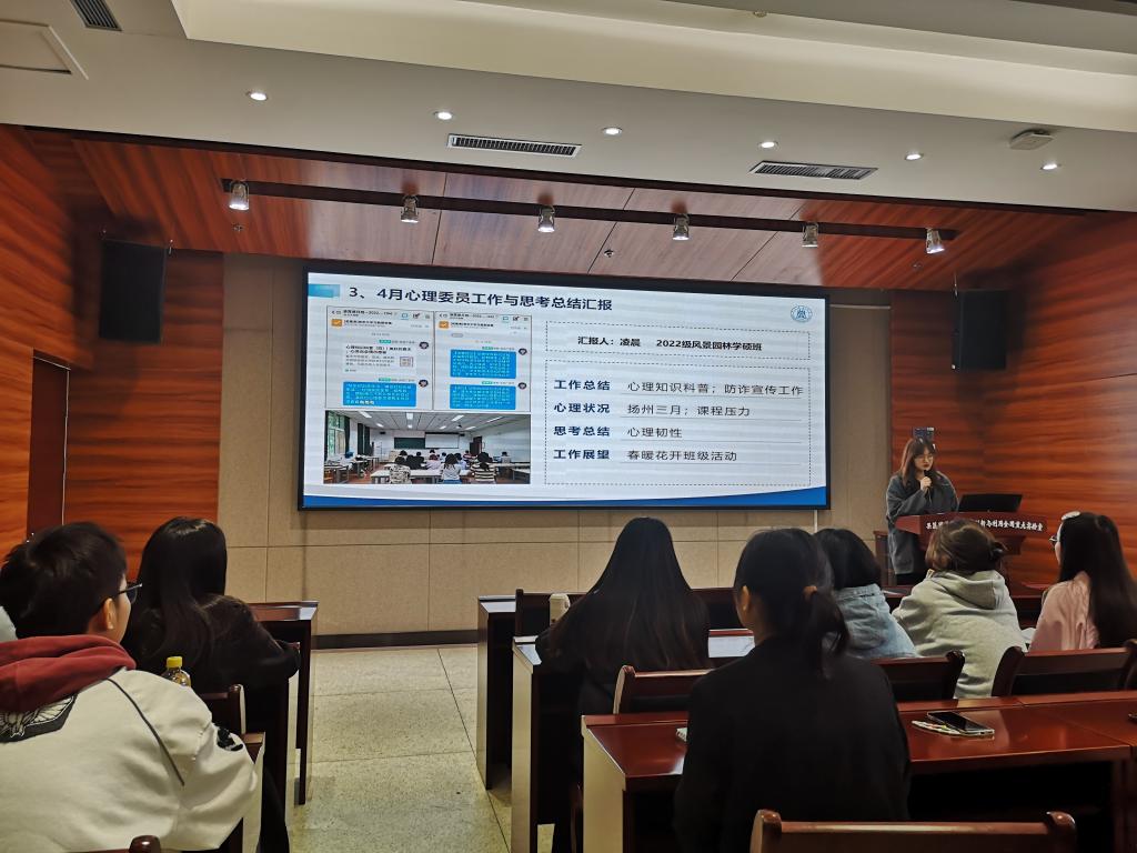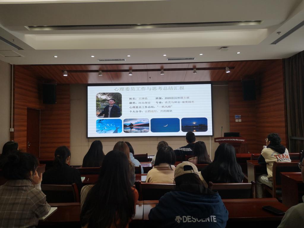接着,研究生心理委员以演讲的方式进行月度工作总结。2021级蔬菜学硕班心理委员李维波深刻剖析了研究生压力来源,分享了压力释放的渠道。2022级风景园林学硕班心理委员凌晨谈道:“八八看球 每月都会发送很多的关于心理健康以及防诈骗的推文,原本我也只是按要求转发,并没有过多地思考过它的作用。但有一天,我们班一位同学碰到我之后说特别感谢我转发到班级群里的推文,她说她那天整个人的状态都非常不好,突然手机屏幕亮了,她拿起来一看是我转发到群里的推文,推文名字叫《美好的春天,心灵也会偶尔感冒》,她说感觉突然被一种暖意包围,点进去慢慢看完感觉自己真的有被治愈到。那一刻我才发现,原来心委的工作真的是非常细腻而又细水流长的。”2022级风景园林专硕2班心理委员杨涛在举办班级活动的过程中发现有一部分同学很害怕参加集体活动,因此他专门为此打造了一堂班会课《如何摆脱社恐》,帮助他们打开自己,释放压力。2020级园林班心理委员王泽浩则分享了一段自己的故事。他谈到自己曾经有一段时间非常的疲惫与焦虑,于是在社交平台上发了一段比较低落的文字,“如果我是云就好了,开心时出现,不开心时可以消失”,而一位陌生网友的评论温暖了他,也给了那个时候的他不小的力量,“因为要远行,所以不能消失”。“每个人都有低落的时候,希望大家在低落的时候能尽快地调整好自己,因为我们还有很长的路要走,不能一直消失失去联络。”说完云的远行,他又分享了一段自己非常喜欢的一段关于月的圆缺的故事,“‘只能反射阳光的月亮,不能控制自己的圆缺,但他知道这些光与暗的变化都会过去,甚至喜欢这些模样,并不会因为别人看不见自己的一部分而怀疑自己,他清楚自己一直都是完整的。’我们每个人都是完整的,开心也好,悲伤难过也罢,都是最真实,最完整的自己,希望我们都可以认真地爱自己。”