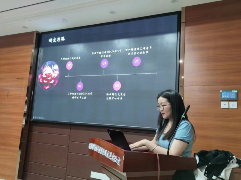冯珊介绍了衰老在整个植物的发育过程中的重要性,她谈到,衰老是一个非常活跃、高度有序和调控良好的发育过程,对植物的生殖适应性也至关重要。冯珊讲到,鲜切花在采后流通过程中,常常面临巨大的损耗,研究鲜切花衰老可以延长鲜切花瓶插期,瓶插期的延长可以大大提高鲜切花的经济价值,研究花衰老对于农作物的结实率和农作物的观赏价值也有着一定意义。