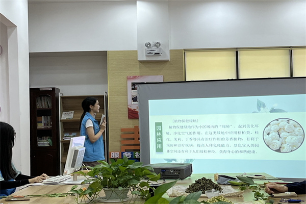 在讲解环节中,园林2201班张蓝方从大家熟悉的芳香植物——茉莉入手,向他们展示了多种芳香植物的观赏特性、香味特性、园林应用以及用途。理论与相结合,在讲解过程中,张蓝方同学示意中老年群体拿起座位旁的芳香植物,用鼻子感受植物真实的美好。