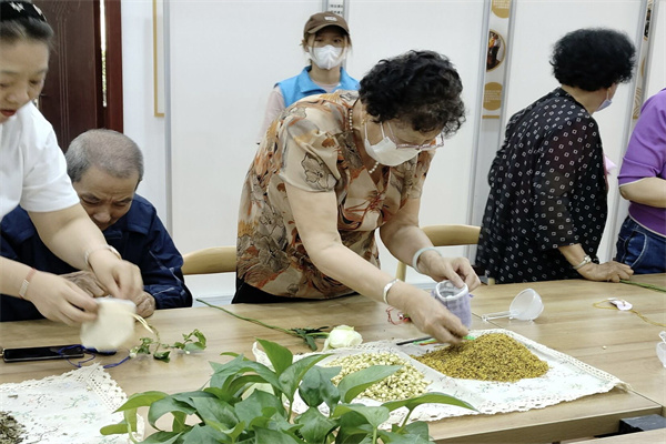 清淡宁神的薰衣草香、沁人心脾的桂花香、提神醒脑的薄荷香、迷人淡雅的茉莉花香、各色各香的干花铺满桌面。在志愿者的协助下,大家根据芳香花的功效选择自己想要的花进行研磨,再将研磨好的干花粉末装入香囊。“你去做这个,薰衣草的,对睡眠很好的。”一位阿姨在听完志愿者的讲解后,向周围晚上睡眠不好的同伴提出建议。大家互相协助,给予彼此建议,一个又一个具有创意香味的香囊跃然而出,他们脸上也洋溢着幸福的笑容。很多人也表示想要多做几个香囊,为家人,朋友送去他们芳香的爱和真挚的祝福。