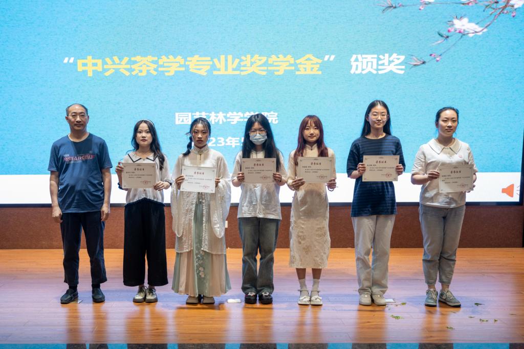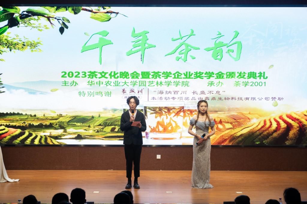 今晚大家除了体验茶韵幽香的茶文化世界,同时还见证了专家及社会企业对茶学学子的鼓励,茶学专家、企业奖助学金4个奖学金同时颁发。企业家代表宣恩县伍台昌臣茶业有限公司贵体恩总经理、鑫鼎集团人力资源部部长周琼和茶学系倪德江主任分别寄语获奖学生及所有茶学学子,“志存高远,深耕茶文化、茶产业,为茶产业贡献自己的青春力量。”