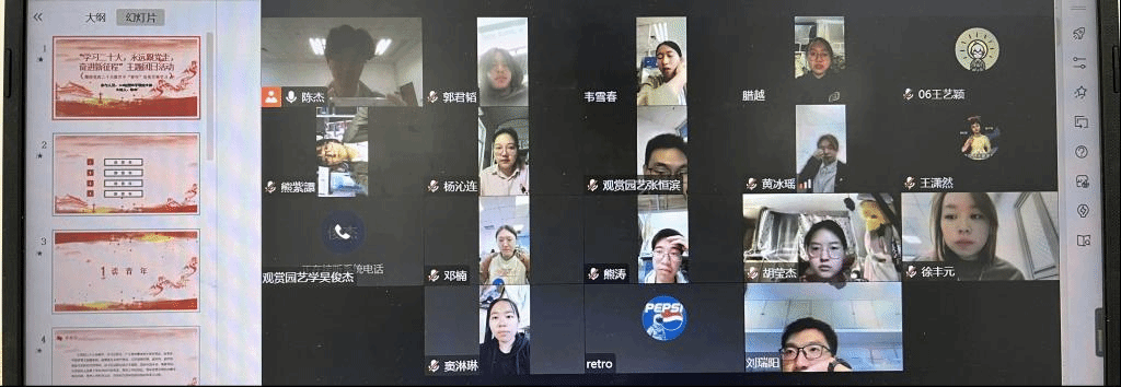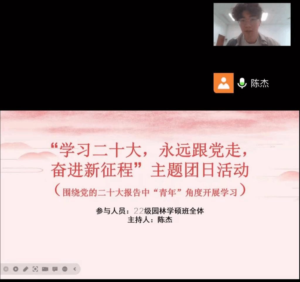 2022年11月8日中午,22级园林学硕团支部于线上开展了“学习二十大,永远跟党走,奋进新征程”的主题团日活动,本次活动由班级团支书陈杰同志主持,团支部全体同学参加了本次活动。
