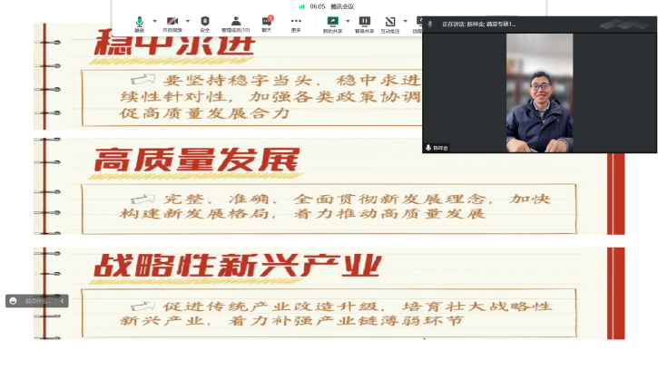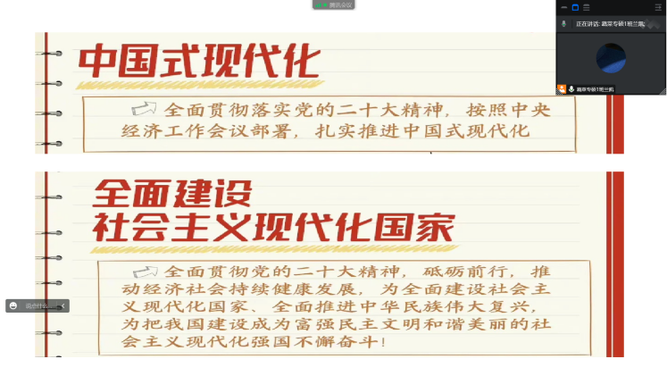 为深入学习宣传贯彻党的两会精神,从学习过程中汲取奋进力量,22级蔬菜专硕1班学生于2023年3月18日于腾讯会议线上形式开展“学习两会精神”主题学习会。