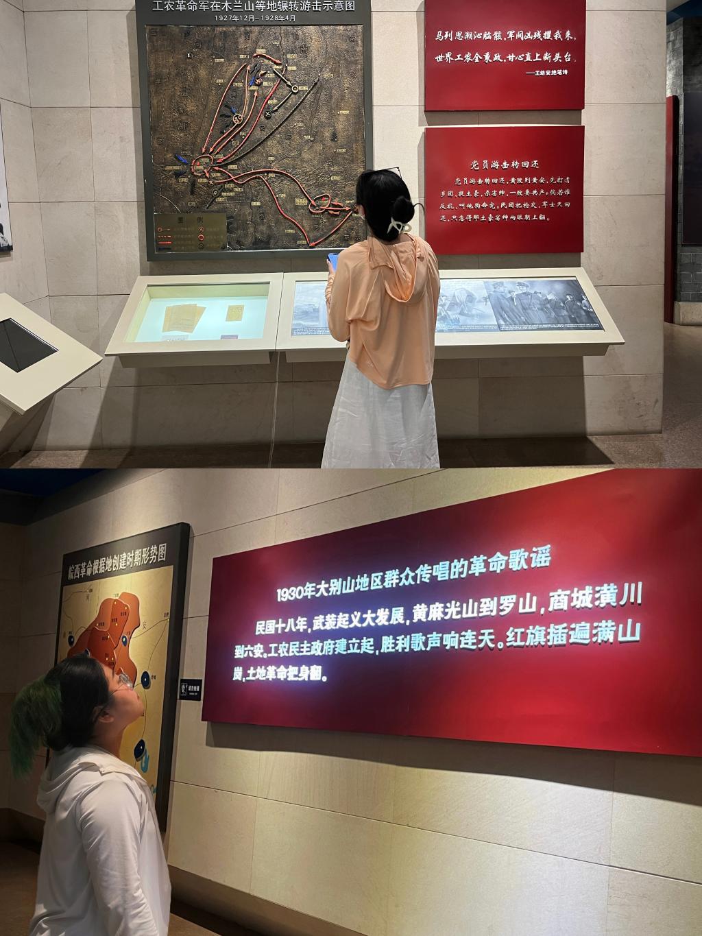 稍作休整后,下午我们来到了黄麻起义和鄂豫皖苏区纪念园。进入纪念园大门,一座汉白玉革命烈士纪念碑巍峨耸立,四周绿树叠翠。黄麻起义是继中国共产党领导的南昌起义秋收起义之后,在长江以北地区首次举行的规模最大的农民武装起义,是在八七会议精神指引下,党领导的武装起义总体布局的重要组成部分。我们感受到无数革命先烈在血与火的岁月里可歌可泣的英雄事迹。在学习参观中,朱孟婷同学表示:我每到一处都被曾经的战斗场景所吸引、被红安人和红安精神所感动,被革命烈士的英勇事迹深深震撼,更加深刻地体会到了红安精神的内涵!