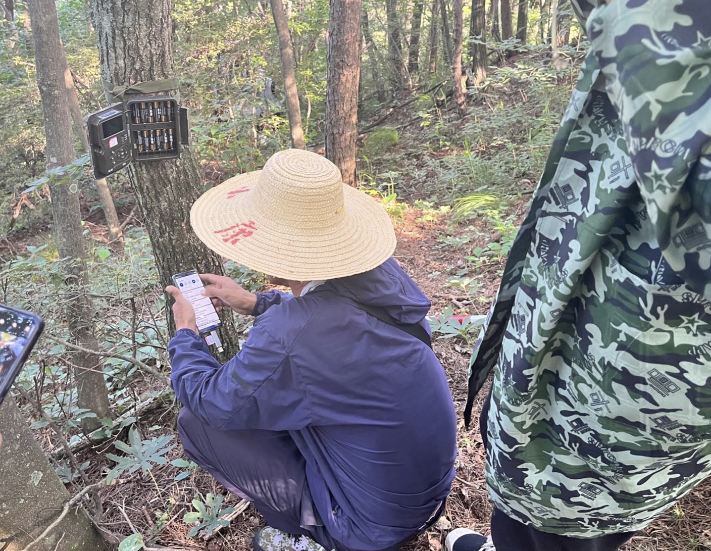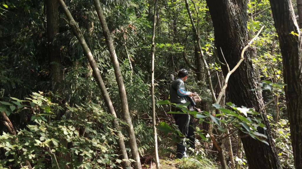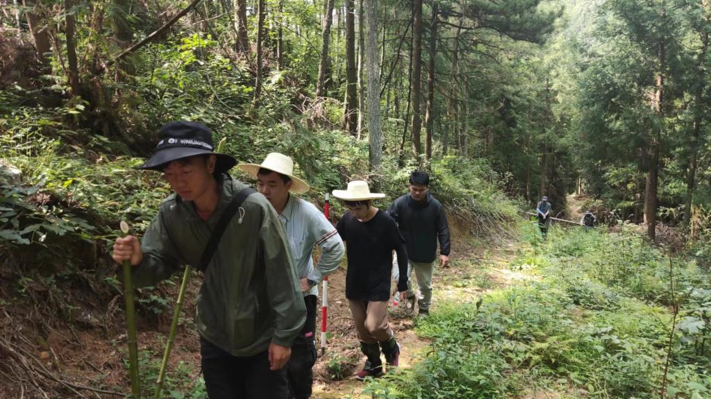 在团队指导教师王鹏程、傅强老师的带领下,调研团队走进森林,在拍摄到安徽麝活动的红外相机点位周围选取代表性样地,对样地内的乔木进行每木检尺,对灌木和草本采用典型样方调查,记录调查样地海拔、乔木郁闭度、乔木高度、乔木胸径、灌木均高、灌木平均盖度、草本平均盖度等指标,利用文字、照片、视频的形式记录湖北大别山常见的灌木和草本植物,重点关注安徽麝食源植物的分布情况。