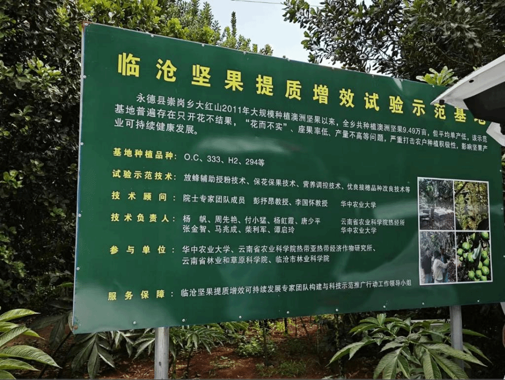 实践团首先来到了位于云南临沧永德县的临沧坚果提质增效试验示范基地,该基地是由华中农业大学、云南省农业科八八看球 热带亚热带经济作物研究所、云南省林业和草原科八八看球 以及临沧市林业科八八看球 共同建设,并由各单位的科研人员一起进行技术指导。该基地目前的主栽品种有OC、333、H2、294等,主要目标是解决澳洲坚果“花而不实”、坐果率低、产量不高的问题,为澳洲坚果产业的可持续性发展保驾护航。