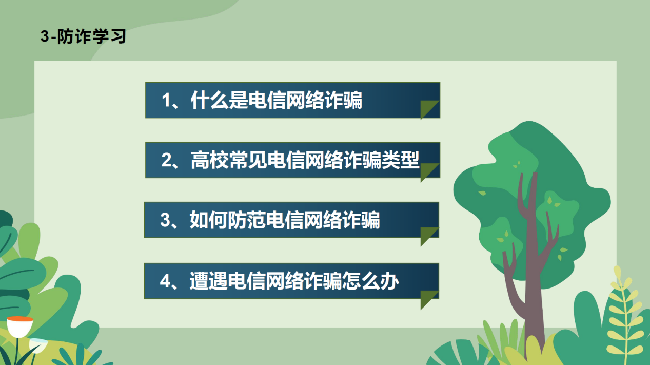 9月12日,为了提高同学们的安全意识,加强网络诈骗的防范,21级园林班召开新学年第1次主题班会。