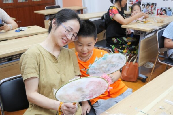 活动伊始,来自园林2203班的志愿者张舒瑾以“神奇的叶子”为主题,向社区儿童科普了叶子的形状、名字、作用等知识点。“小朋友们看,这片叶子的形状让大家联想到了什么呢?”张舒瑾提问道,屏幕上熟悉而陌生的叶片图案引得小朋友们积极思考,一位小女孩儿迅速举手抢答:“像我们的手!”与此同时,课堂上踊跃出一波热烈的讨论声“像鸡爪!”“像枫叶!”......志愿者对小朋友们的想象力表达了积极的认可,并进一步推进后续科普内容,课堂上洋溢着活跃愉快的氛围。科普过后,活动来到了团扇装裱环节。 小朋友在志愿者的指导下,与家长一同制作团扇作品,现场欢笑不断。孩子们积极发挥想象力,不拘一格地将不同的干花种类搭配,摆放错落有致,鲜艳的干花点缀在原本朴素的团扇上,扇面显得愈发精致漂亮。
