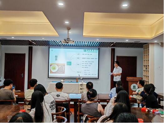 东汉的《神农本草经》中有记载“神农尝百草,日遇七十二毒,得荼乃解”,“荼”即是“茶”字的前身,这就是茶叶的发现起源。主持人不仅讲解了茶叶的发现与起源,还为同学们普及了茶叶各阶段的使用方法、茶叶的保健功效和茶叶的科学饮用方法等知识。中国茶文化知识如同画卷一般,在主持精彩的讲解中徐徐展示在大家面前。除传统茶文化知识之外,主持人还讲述了一些新式茶饮的制作方法。当提及千里香咖啡等新式茶饮制作方法时,同学们的热情十分高涨,不少人拿起手机进行拍摄记录。