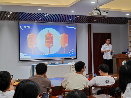 随后进行了热闹的茶文化猜灯谜环节,同时为答对的同学准备了精美礼品。“一只无脚鸡,立着永不蹄,喝水不吃米,客来把头低”,主持人念出灯谜,大家在下面纷纷讨论着谜底。随着答题的热情持续高涨,主持人话音未落就已经有许多人的手高高举起,室内充满了阵阵欢呼和掌声。当最后一个灯谜揭晓完答案,本次茶文化主题的中秋茶会活动也将迎来落幕。最后陈炫希老师对中秋茶会活动进行了总结发言,为同学们送出中秋节的美好祝福。
