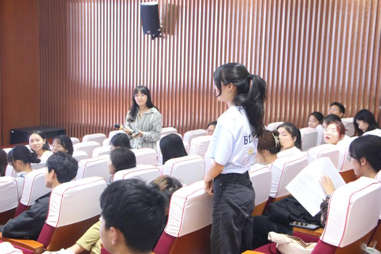 会议第四项,研究生会新闻与宣传部总负责人胡亚萍与大家一起探讨关于全员记者化的想法。首先,她围绕公众号、视频号、海报制作工作与部门建设四个方面对过去一年的工作进行简洁明了的总结,接着她提出:“全员记者化应当是让学生干部们都参与到其中,锻炼全员的脚力,眼力与笔力。”脚力为基础,呼吁大家真正讲好园林故事;眼力为关键,鼓励大家锻炼思维能力,要善于观察与判断;脑力笔力同样至关重要,激励大家每个人都要参与写稿,形成审稿小组互相促进。在场的各位学生干部纷纷对胡亚萍的发言鼓掌表示赞同。