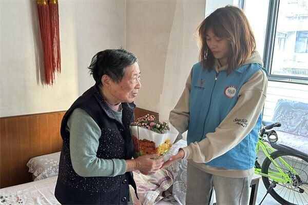 最后,志愿者们连同华农西社区工作人员,前往小区内看望独居老人并赠送手捧花,与老人们共话家常,表达真切的祝福与关心。
