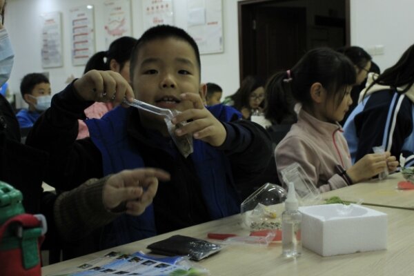 “要像保护春天里的树苗一样保护世界孩童”,志愿者齐金晨这样说道。她向小朋友们科普了一系列生存于自然逆境中的神奇植物,以“斗士植物”的例子引导孩子们向勇敢的生命学习,珍惜生活中的美好,遇到困难时,积极面对、勇往直前。实践环节中,志愿者蒋玉洁向小朋友们仔细讲解了植物微景观制作的材料、步骤及养护方法,小朋友们在志愿者的帮助下亲自动手制作,铺上轻石、水苔,覆盖营养土,将新鲜植物移栽土中,最后小心翼翼地做点缀,很快小朋友与家长一同合作,制作出了生机盎然的生态瓶。