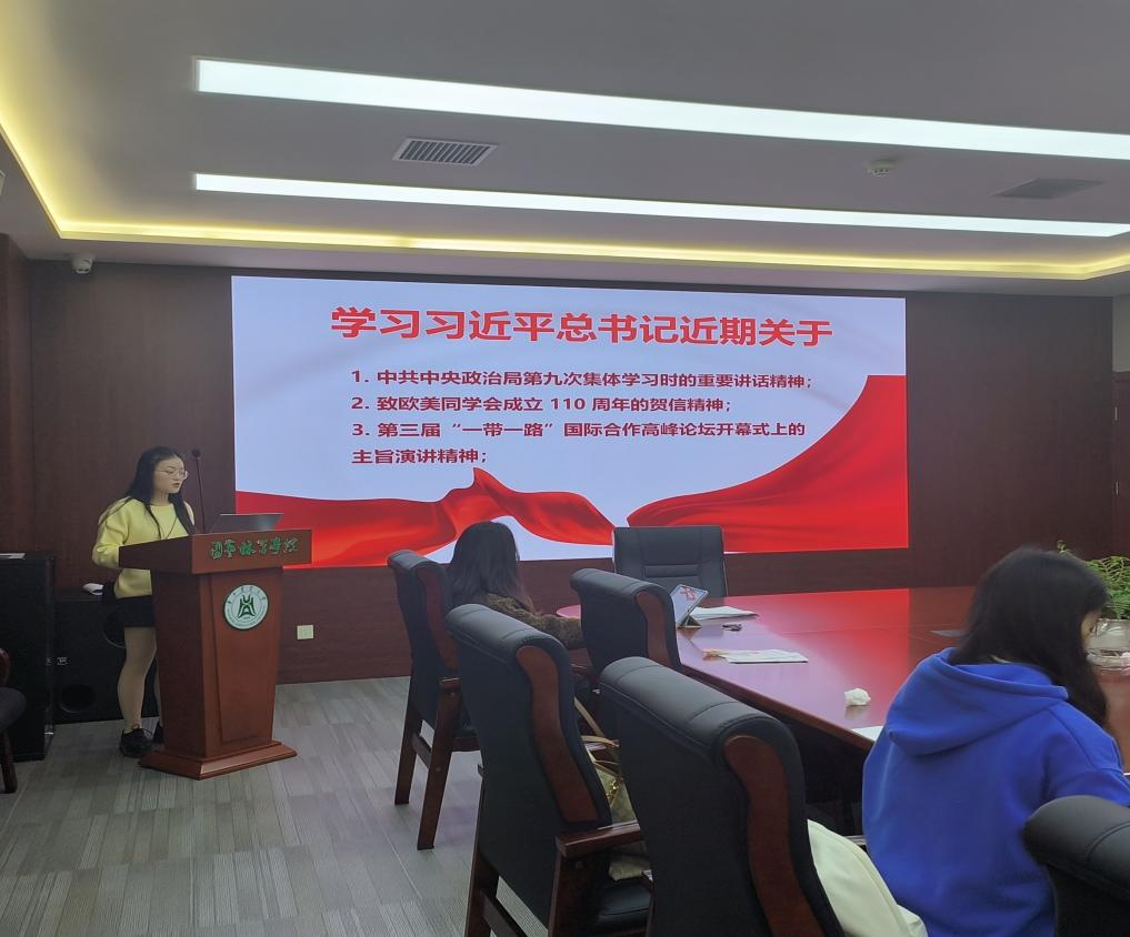 会议伊始,袁义平同志带领支部成员学习了习近平总书记在中共中央政治局第九次集体学习时的重要讲话精神、习近平总书记致欧美同学会成立 110 周年的贺信精神、习近平总书记在第三届“一带一路”国际合作高峰论坛开幕式上的主旨演讲。