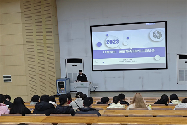 12月12日晚上,2023级蔬菜专硕班就业主题班会在三教S2报告厅召开。班长李抗、团支书刘艳丽及全班成员到场参会,会议由就业委员兰振东主持。