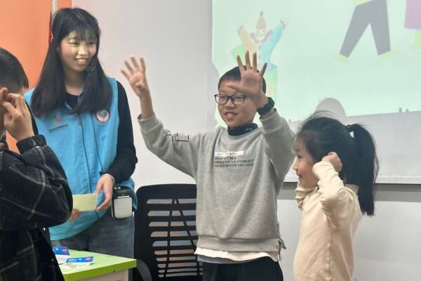 活动伊始,志愿者蒋玉洁用一个谜题调动小朋友的积极性,“左一片,右一片,隔做高山看不见,说起话来听得见,有小朋友这个这个谜底是什么吗?”小朋友开动脑筋、认真思考,一个小女孩迅速举起手回答道:“是耳朵!””对,就是耳朵,让我们为这位小朋友鼓鼓掌!”志愿者微笑着肯定道。随即,蒋玉洁又抛出一个问题引发了小朋友们的讨论:“在日常生活中,你会如何与聋哑人交流呢?”小朋友们热情回应,纷纷提出自己的想法,有人说通过肢体语言来传达意图,有人道可以通过写字表达,也有小朋友称可以用手语来交流。志愿者蒋玉洁顺势将活动引入“你划我猜”的互动游戏环节,帮助小朋友亲身体会聋哑人士的日常交流感受。