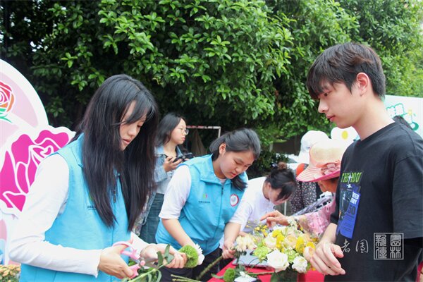 本次活动中,张瑜服务队的服务主要工作为插花艺术的宣传,利用小菊、桔梗、玫瑰、绿毛球等多种花材进行专业花艺展示。造型雅致的插花作品吸引了不少居民和学生前来围观体验。参与者既可以观赏志愿者们的插花表演,也可以自己动手DIY,在实践中感受鲜花带来的幸福感。轻松又不呆板的展现形式不仅增强了志愿者与服务对象之间的互动感,也给大家带来更沉浸的体验。一片欢声笑语,一片花团锦簇、一片其乐融融,生动展现了玫瑰湾社区联合张瑜服务队创新基层治理的风采形象。