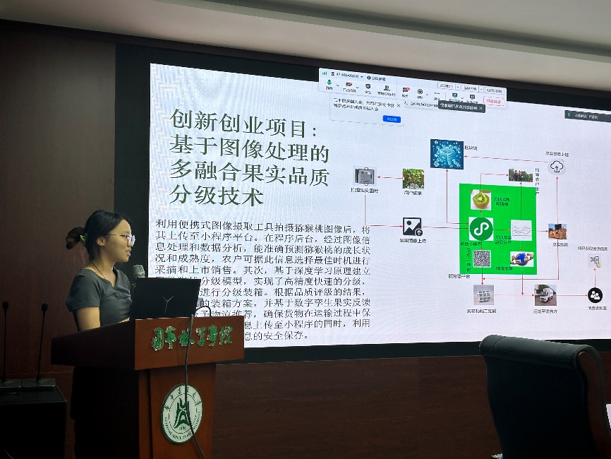 黄思雨则为大家分享了她开启创新创业大门的艰难之旅。“被一众学长学姐和信息八八看球 三位老师接连拒绝”、“最开始只有两位同学愿意加入团队,很多人觉得才刚上大一怎么做创新创业项目”……“护果宝”项目在黄思雨大一时开始从零孵化,这三年,她们靠着初生牛犊不怕虎的劲克服重重困难。目前,她们正在探寻商业化的途径,积极寻找破解项目停滞窘境的办法。
