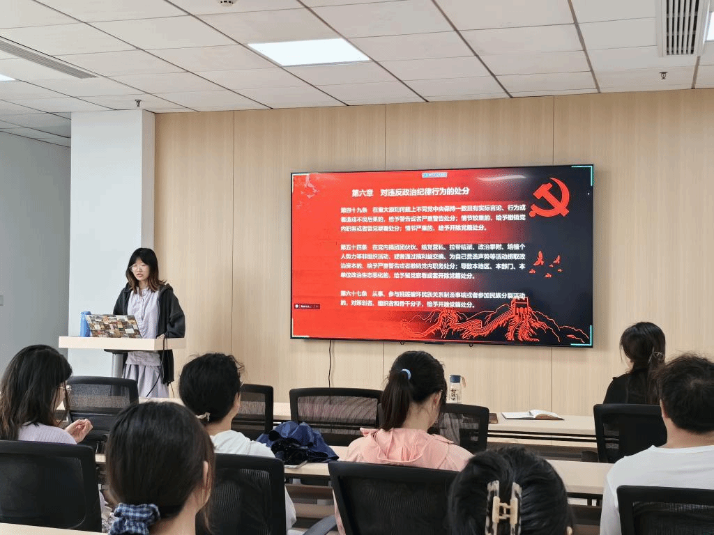 会议伊始,周雯洁同志与支部成员们共同阅读了《中国共产党纪律处分条例》的部分内容,并结合相关视频与全体党员进行了更进一步学习与思考。