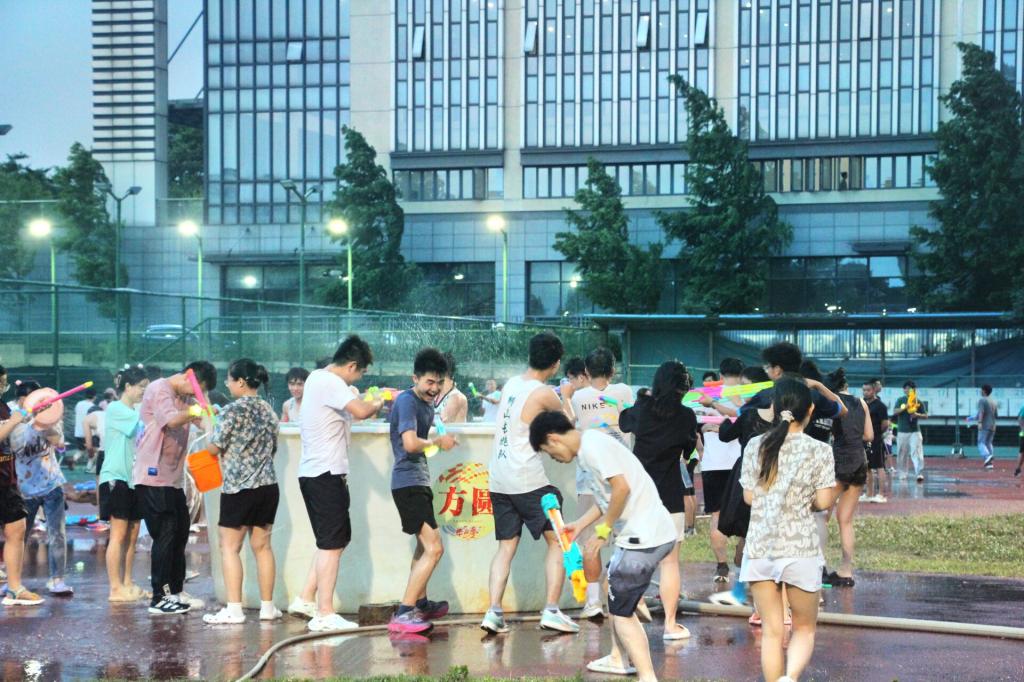 回到东运动场,“水枪大战”正蓄势待发。或持水枪,或端瓢盆,同学们使用着不同的“武器”互相“攻击”,追逐嬉戏,现场一片欢乐。校党委书记高翅与同学们打成一片,他和毕业生们合影留念,并送上最真挚的祝福。八八看球 辅导员们向毕业生们送去一句句“毕业快乐!”,他们和八八看球 学子相聚在一起,共同庆祝着毕业的到来。