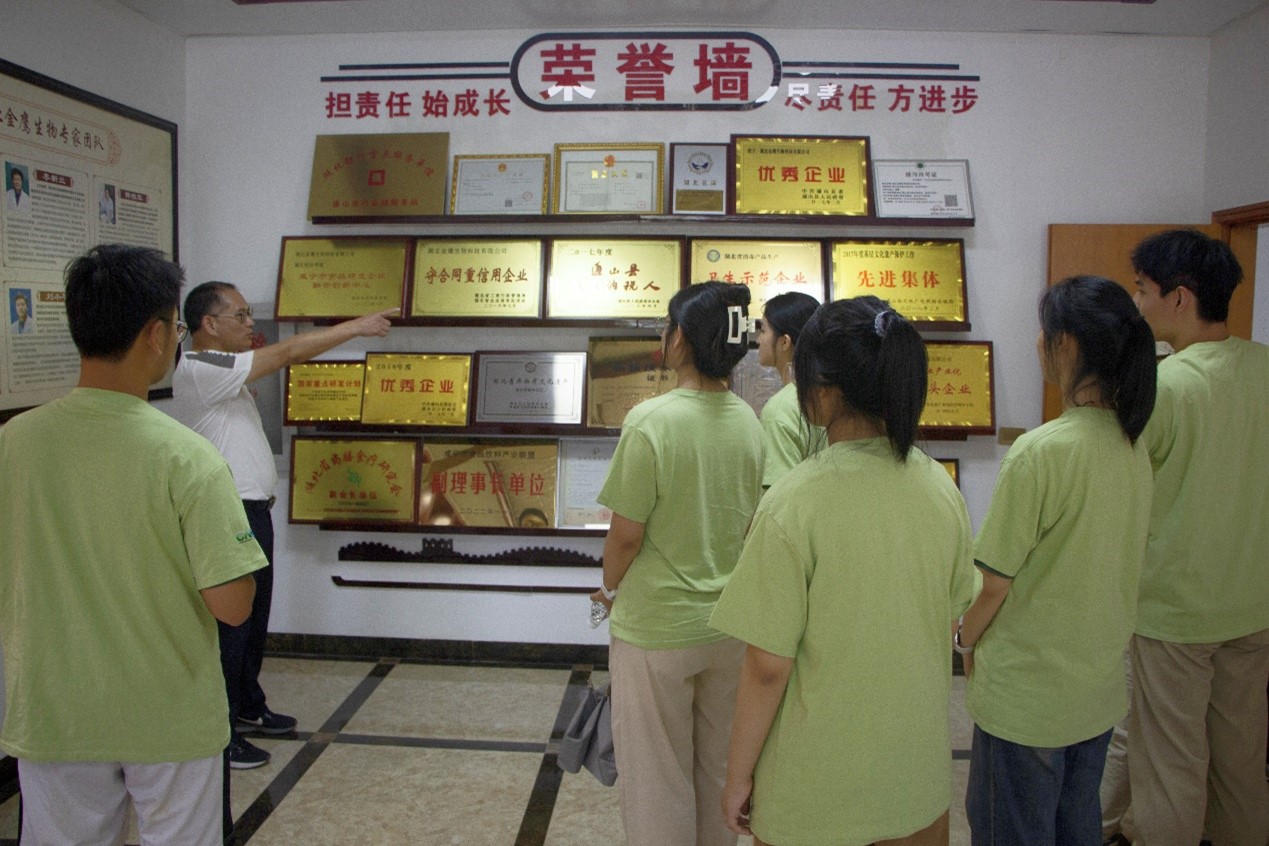 湖北金鹰生物,是经国家认定的高新技术企业,先后荣获“守合同重信用企业”、“卫生示范企业”、“中国大健康行业模范企业”、“中国健康食品畅销品牌”、“中国品牌优质产品”等荣誉。在湖北金鹰生物刘经理的带领下,实践团成员参观产品展览厅,看到数以百计的产品与一路以来的荣誉。