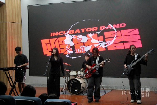 交流会伊始,孵化器乐队带来《天才艺术家》《爱人错过》两首歌曲。歌声清脆,架子鼓激昂,贝斯低鸣,吉他高频......精彩的演奏迅速点燃了全场,将观众们带入到热情洋溢的晚会氛围中。随后曲怀恩以一曲弹唱《形容》,将歌中情感娓娓道来。