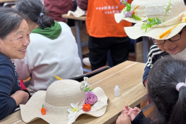 小朋友们也展现出无限创意,有的将装饰的南瓜轻巧地放在帽顶,仿佛为草帽增添了一抹童趣;有的则将金黄的麦穗巧妙地搭配在花朵旁,宛如为帽子披上了一层丰收的光辉。这些生动的瞬间吸引了周围老年人的目光,大家纷纷拿出手机,记录下这份纯真的快乐。教室也因为这样的互动变得更加温馨。