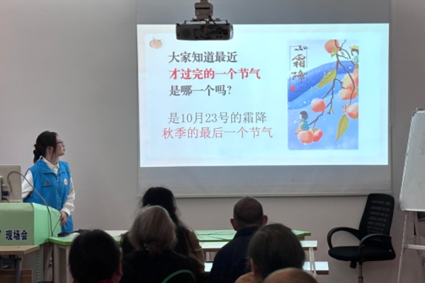 “霜降,这一标志着季节更迭的重要节气,不仅是自然界变换的信号,更是我们养生保健的关键时刻。”来自经济2202班的志愿者张彩丽以秋季的最后一个节气为介绍主题,引出霜降的历史与文化,将这一传统节气与适老化银龄科普相结合,着重阐述了霜降时节的养生要点。谈及关节保健时,张彩丽特别强调了适度运动的重要性。她建议老年朋友们可以在饭后悠闲散步,或者每日坚持泡脚,以促进血液循环。这些既实用又贴心的建议,赢得了在场老年朋友们的纷纷点头与认可。当话题转向饮食调养时,张彩丽提到的“四土”和“三果”更是引起了小朋友们极大的兴趣。他们纷纷举手提问,与张彩丽积极互动,现场气氛热烈而温馨。