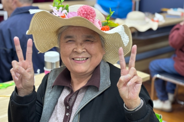 为了进一步增强活动的趣味性,张彩丽还通过猜谜的形式引出了活动的下一个环节——花艺草帽制作。她巧妙地将草帽与霜降时节的丰收元素相结合,带领大家走进了一个充满色彩与创意的花艺世界。动手环节,志愿者们耐心地引导着老人们挑选花材,细致地将它们装点在草帽上。随活动的深入,老人们的草帽逐渐成型,个性化的设计展现了他们的审美与创意。每一顶草帽都如繁花似锦,绚丽多彩。一位老奶奶将自己制作的草帽戴在了行动不便的老伴头上,无言的行动表达了他们之间的深厚情感。