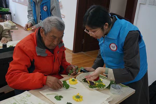 随后,邹心如向老人们详细说明植物拓印的操作流程及注意事项,并由其余志愿者分发用于拓印的帆布包和材料。在制作过程中,老人们热情高涨,充分发挥自己的创意和想象力,在志愿者的耐心协助下仔细摆好花叶并用锤子轻轻敲打,使其在帆布包上留下独特的印记,现场气氛温馨融洽。随着一幅幅精美的植物拓印作品逐渐诞生,老人们看着自己的手工作品,脸上也洋溢起喜悦的笑容,一位爷爷开心地笑着说道:“以后出门买菜,我又有了新的搭档!。”