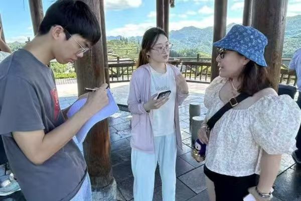 实践团选择人流量集中的隆恩亭作为采访点,在7月4日分上下午两时段进行。为了解市场对绿色无公害茶叶的需求及消费者认知,队员们围绕绿色无公害茶叶的认知、购买意愿及市场问题等,对游客进行了针对性访问。茶学2301贺逸凡聚焦消费习惯,询问游客“购买茶叶时是否会关注‘无公害/绿色认证’标签”及购买经历。其发现,仅少数游客会主动关注认证标签,口感是否符合个人喜好是大部分游客的首要考量。
