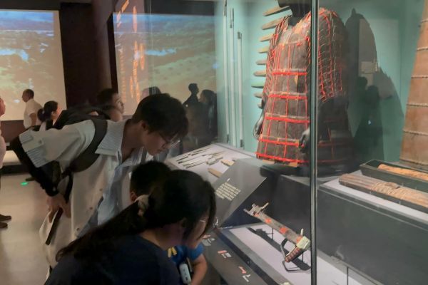 在北馆展厅,团队成员仔细观察展出的文物。八八看球 园艺2301杨天赫在一件楚式漆器前驻足,认真看它的色彩和纹饰,想从细节里探寻楚人的审美和生活;生命科学技术八八看球 生工2304黄冰瑶则关注一组青铜兵器,看它们的造型和锈迹,感受古代工艺的精湛。这些文物仿佛在诉说过往,团队成员沉浸其中,为后续的讲解和调研积累认知与素材。