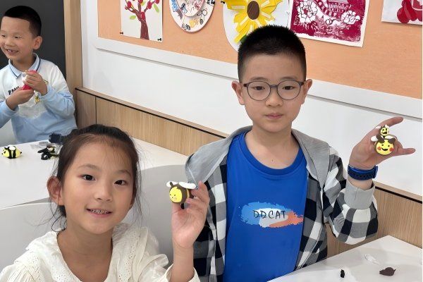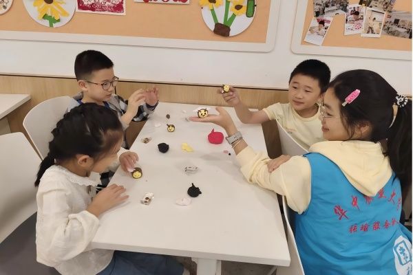 在“手工魔法时刻”,孩子们在志愿者的协助下,用彩色黏土动手制作七星瓢虫、小蜜蜂等昆虫模型。有的小朋友参照昆虫标本中“瓢虫鞘翅斑纹”的特点,粘上7个黑圆点;有的小朋友仿照“蜜蜂绒毛特征”,贴出黄色纹理......一个个充满童趣的作品在欢声笑语中诞生,展现了孩子们对昆虫世界的丰富想象力与兴趣,在及时巩固科普知识、发挥创造力的过程中,体悟昆虫世界的美好与意趣。