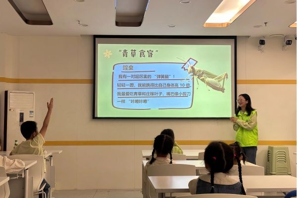 “大家知道有哪些昆虫会‘隐身术’吗?”景园2302赵畅以枯叶蝶、竹节虫等极具反差感拟态特征的昆虫迅速抓住孩子们的目光,并通过生动的图片和通俗的语言,结合活动现场的标本观察,介绍了蝗虫、蟋蟀、瓢虫、斑衣蜡蝉等多种常见昆虫的外形特征与行为习性。讲解过程中,孩子们踊跃发言,积极回答志愿者提出的问题,现场气氛热烈。
