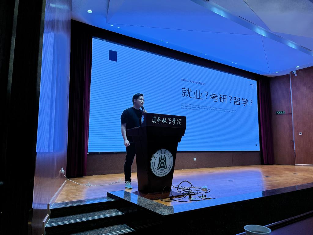 陈鹏学长为同学们分析比较毕业生就业、考研和留学不同去向的优势与劣势。