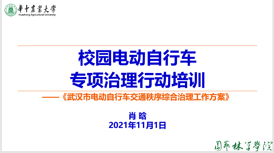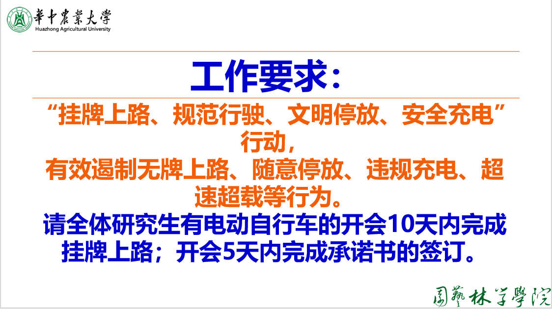 会议伊始,肖晗带领参会人员就“校园电动自行车专项治理行动”展开学习,学习内容包括武汉市公安局交通管理局“致广大师生的一封信”和华中农业大学“文明交通承诺书”、“电动自行车安全使用八不准”。会议强调,校内师生应安全乘驶,规范乘驶,不酒驾酒乘、不超速不并行、不占道不载人、不闯信号灯;应文明停车,规范停车,不占安全通道、不停线外区域;应安全用电,规范充电,不室内充电、不私接飞线。会议中肖晗建议大家,未上牌车辆尽量在10月15号之前上牌,10月20号后交警将在校内执法,违规者交警将会依法罚款或扣留车辆。同时,就室内充电问题肖晗也列举了室内充电瓶起火案例,他强调室内充电安全隐患巨大,不能冒险违规充电。学习结束后,肖晗对校内师生电动自行车使用提出要求并部署以下工作,首先要求电动自行车车要“挂牌上路、规范行驶、文明停放、安全充电”,其次要求全体研究生有电动自行车的会后10天内完成挂牌上路,会后5天内完成承诺书的签订。