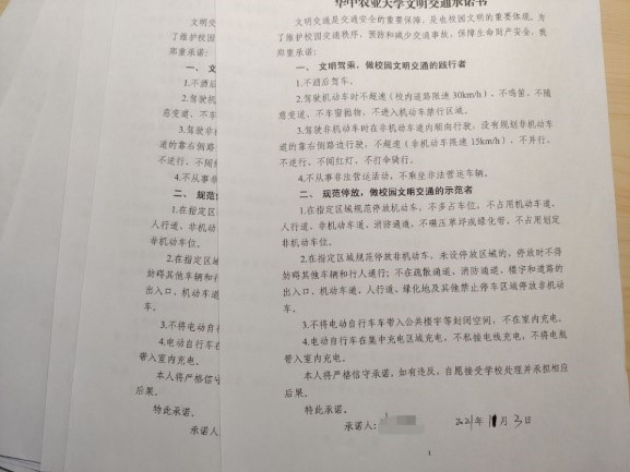 2021级果树专硕1班于11月3日12:30在园林南楼204召开安全教育主题班会。班长首先强调了遵守交通规则的重要性,接着播放了近年来多地关于电动车自燃、爆炸的真实案例视频,倡导大家如有需要一定购买合格电动车,到指定地点进行充电。接着全体成员学习了武汉市公安局交通管理局致广大师生的一封信、华中农业大学电动自行车安全使用“八不准”和华中农业大学文明交通承诺书的详细内容,并在承诺书上签字。
