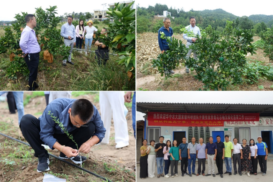 郭文武教授一行还顺路前往湖南省张家界市永定区推进湖南地方特色柚品种—菊花芯柚无核改良项目。将课题组自主培育的柑橘核心种源与菊花芯柚杂交创制的有性后代进行温室嫁接和田间高接,评价筛选果实无核、果皮薄、可食率高、水分足且具有菊花芯柚特征性状的优良单株,助力菊花芯柚品种更新换代和乡村特色产业振兴。