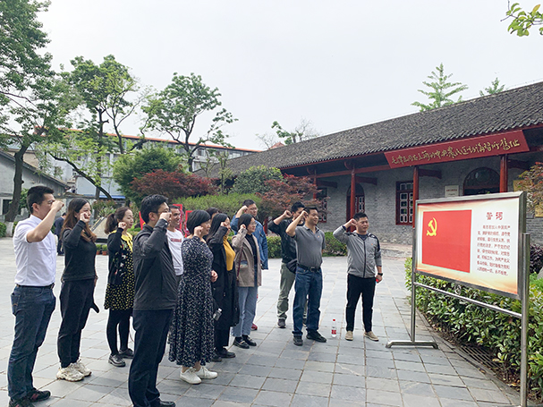 在革命旧址,支部书记卢刚带领全体支部党员面向党旗、举起右拳,重温入党誓词并庄严宣誓。