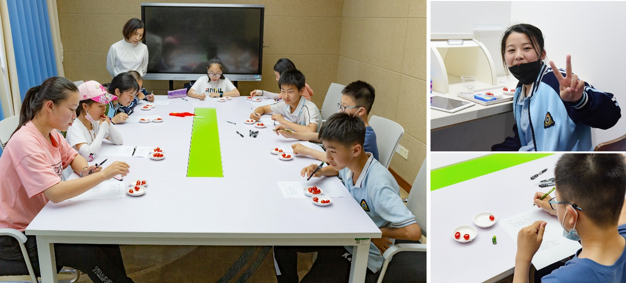 同学们在陈嘉景老师、博士生刘园及硕士生孔佳涛的指导下,在培训室里认真聆听园艺感官评价的项目流程,一张张富有朝气的面庞上一会露出惊讶的神色,一会露出惊喜的表情,小朋友们互相交流提问,当听到今天他们要品评的是樱桃番茄时,气氛一下子活跃了起来。有人问会不会这里的樱桃番茄最好吃?这些番茄来自哪里?番茄是干净卫生的吗?品尝完了能不能带回去给老师和家长尝尝?刘园一一做出回答并感慨到孩子们的想法“不简单”,小朋友们思维开阔,富有创新创造力,懂得享受生活,富有爱心和孝心,有好东西知道给老师和家长分享,是一群最有爱的小朋友们!