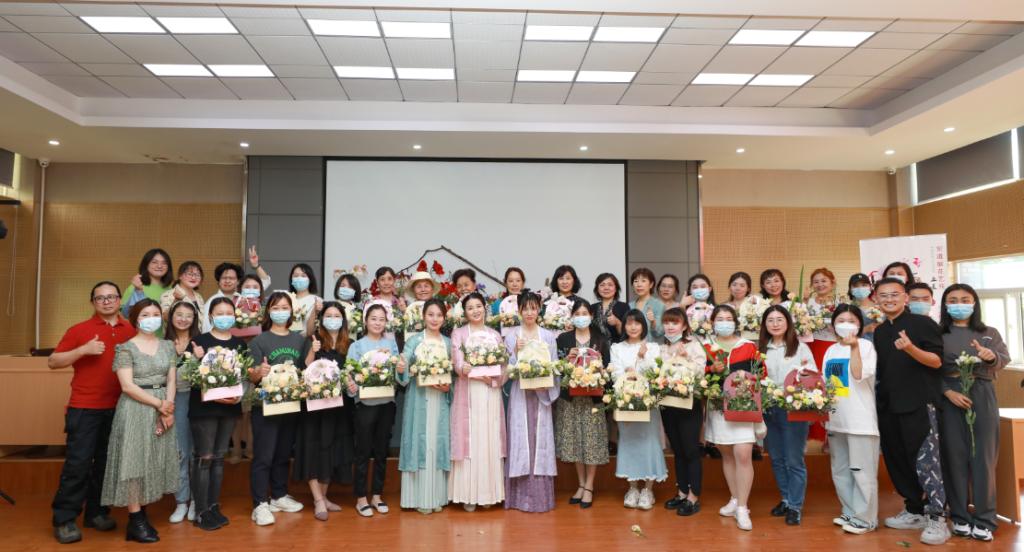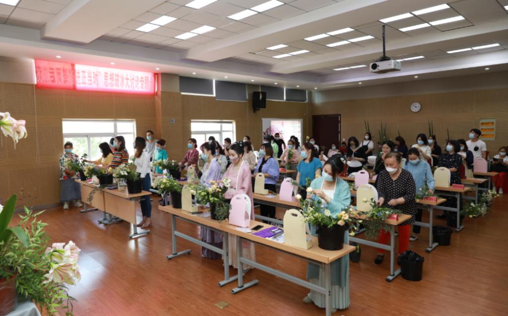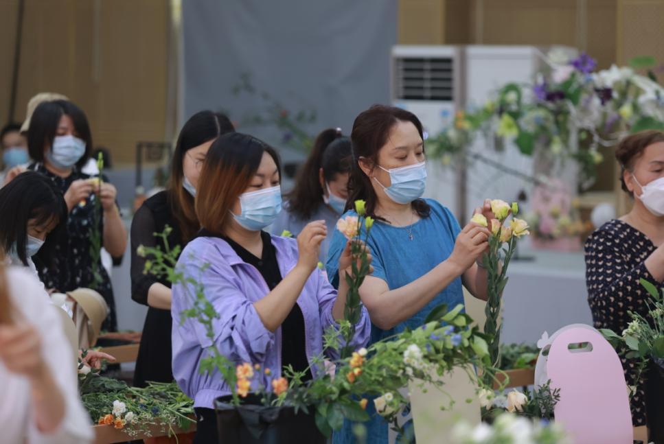 “先用绿叶打底,取大朵主花作为构景焦点,再以小配花进行点缀。”“插花讲究高低错落、上轻下重,整体色调把握浅色在上,深色在下的原则”……教室内,40余名职工代表与社区居民在专业花艺师的指导下共习花事:识花朵、搭框架,逸兴遄飞巧思发,将个人情趣融入花艺创作,造就独一无二的“立夏盛景图”。