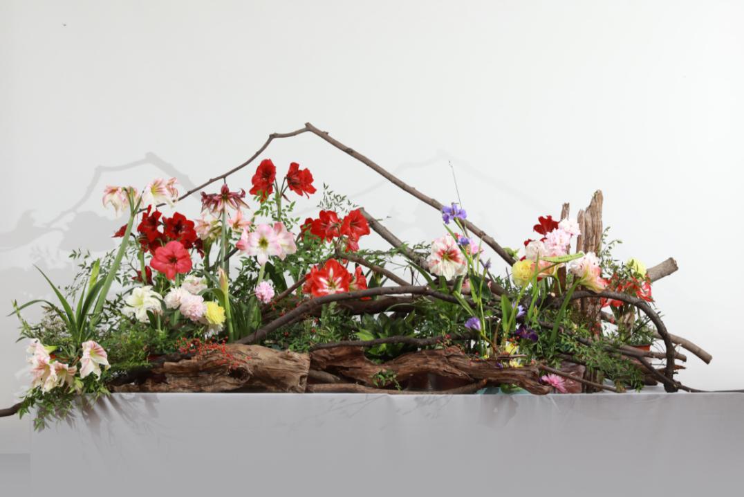 本次活动还陈列有十余组大师花艺作品,线上线下均可欣赏。华中农业大学副教授秦仁强创作的大型花艺作品《湖山胜意》为当日点题之作。长3米,宽2米的造型中,树枝横斜,蜿蜒虬曲,如山峦跌宕,朱顶红热烈胜火,鸢尾袅娜挺立,似山花烂漫,还有红润樱桃果、青黄小麦苗等立夏新品点缀其间,以风情万种的湖光山色盛赞夏之蓬勃,祝颂万事皆胜意。