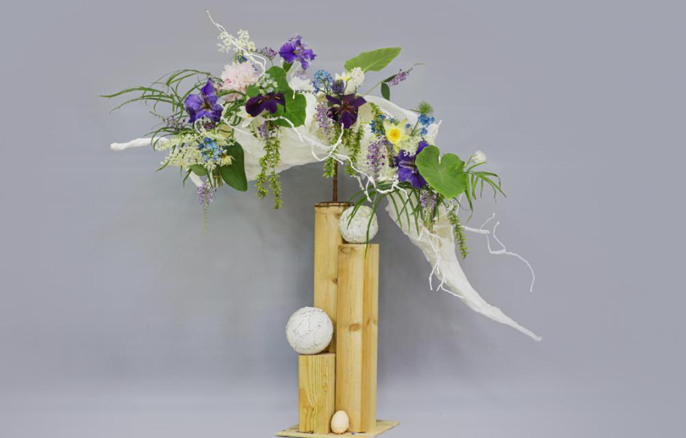 花艺讲师何垒乐的《斗蛋》则巧妙融入立夏节日习俗意趣,白色的圆球,座下的小小鸡蛋均呼应立夏“斗蛋”习俗,紫色的鸢尾娇艳欲滴,黄色的睡莲清新雅致,阔叶舒展,枫杨下垂,让人忆起儿时夏日午后那个清甜愉悦的梦。