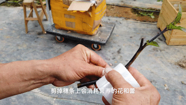大棚内,地上一个纸箱中堆满了深紫色的枝条,每根长度不到20厘米,外围缠绕着透明的薄膜,头部是嫩绿的新芽。