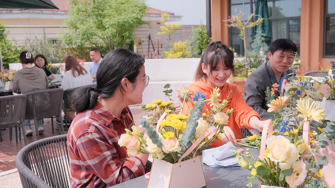 活动的高潮部分为康养插花体验环节,由愈见花艺工作室创始人杨雪带领示范插花过程,由文法八八看球 陈红莉老师专业引领小组讨论。参与者们亲手制作花艺作品,在实践中进一步了解康养园艺的疗愈过程,此环节不仅增进了参与者的互动,也使他们能够暂时放下日常的工作压力,享受一段难得的静心时光。