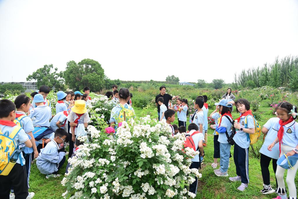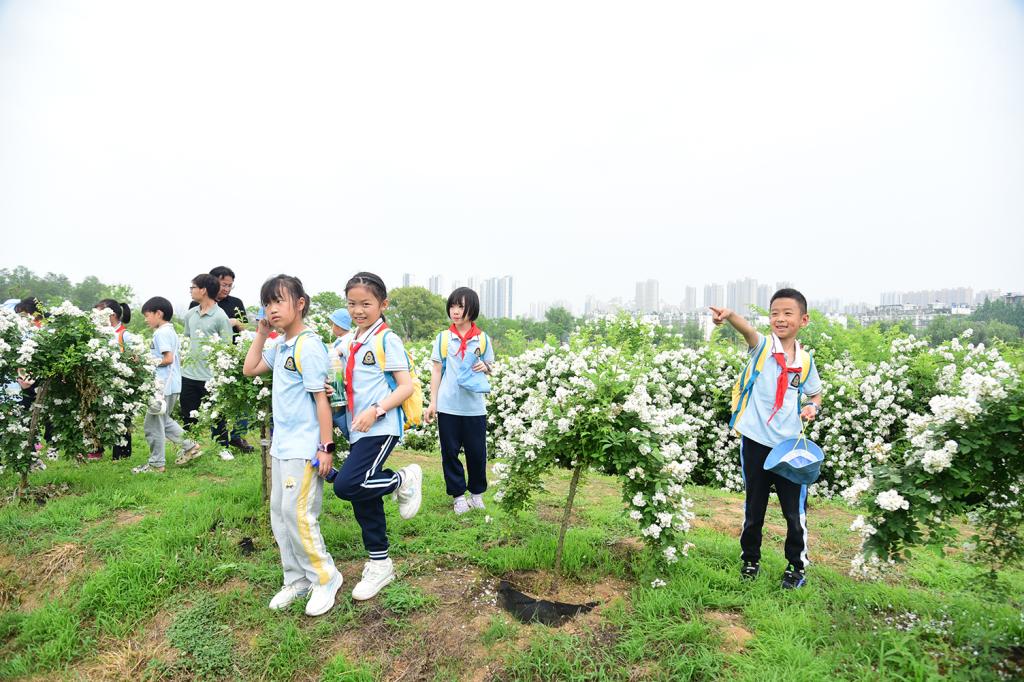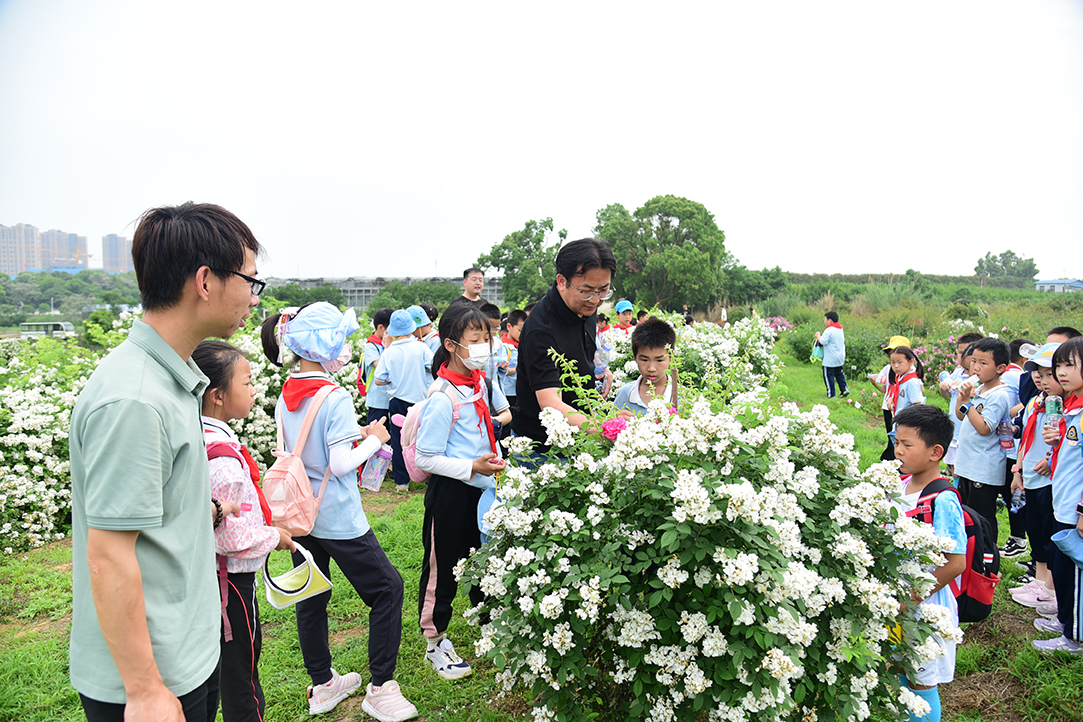 当前正值盛花期。同学们在花圃里数数月季有多少种颜色,闻一闻各种月季花有什么香味,叶片、枝刺有哪些不一样的地方,跟随兴趣去提问和思考。走到一片野蔷薇前,盛放的白色小花层层叠叠宛若花海。仔细观察蔷薇花的花序,叶子的形状,托叶的裂纹……