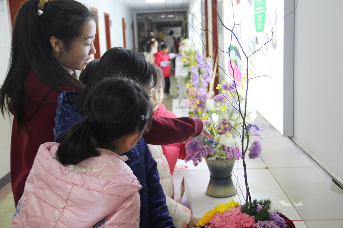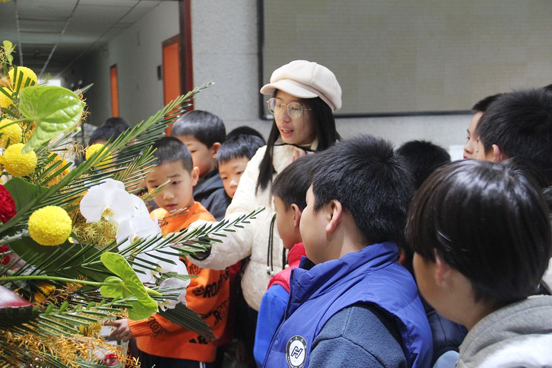 小朋友们在志愿者们引导下,逐一欣赏园林学生创作的插花艺术作品,大厅里由“以质图强 融创致新”八个大字呈现的主题花艺作品,以红银交织的叶片,金黄向日葵倾吐着骄阳般的赤诚,黄菊、红康乃馨与绿花烛在岁月枝头争艳,白蝴蝶兰若玉瀑飞泻,灵动间满是清韵诗意。2022级观赏园艺邓楠介绍到,作品勾勒出华中农业大学在强国新程中,秉持质韵之根本,孕育希望之新蕊,融多元之精粹,绽就世界一流学府的锦绣华章,矢志为家国山河添色,为人类福祉倾怀,奏响一曲昂扬奋进的时代雅颂。
